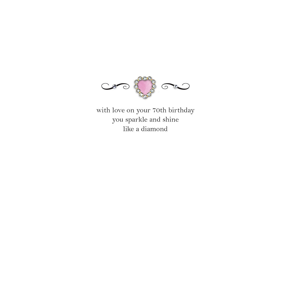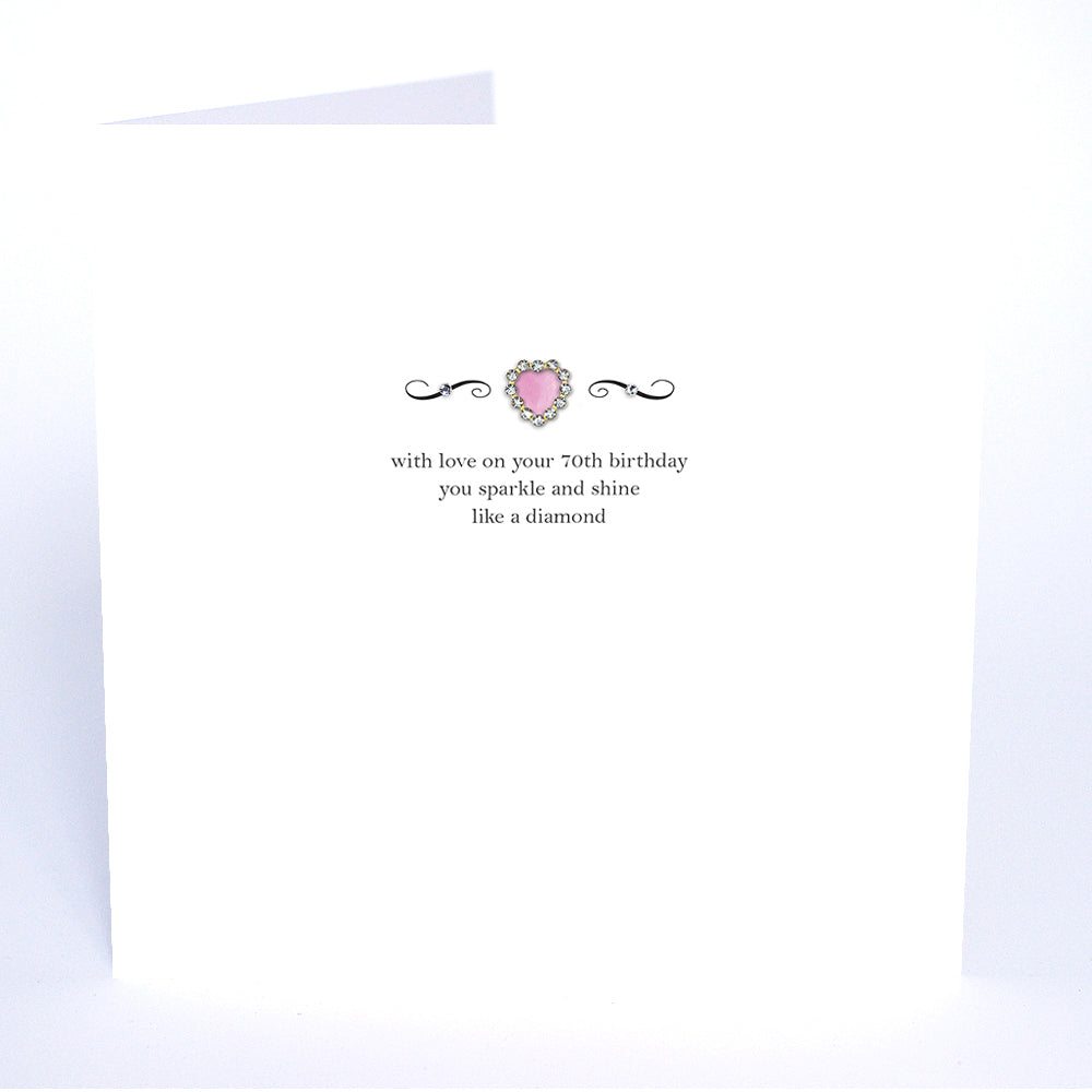 An elegant, stylish and classically sparkling 70th Birthday card. These beautiful quotes of celebration and love are adorned with our exclusive, genuine crystal hearts, printed and delicately hand-finished onto watercolour board in our Sussex studio.