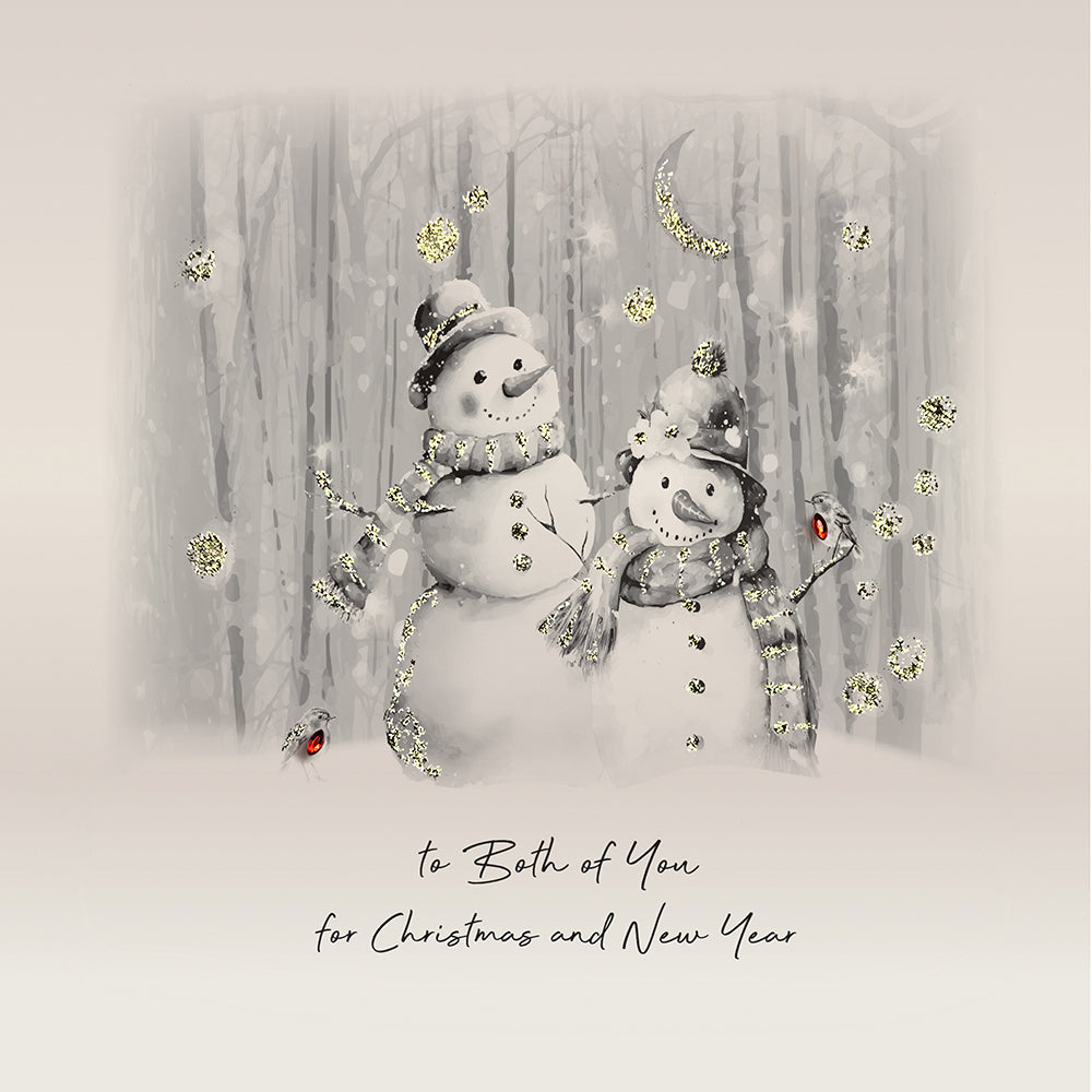 A beautiful Both Of You Christmas designs to conjure up everyone’s idea of an enchanted Christmas walk amongst freshly fallen snow. Illustrated onto a luxury board that glows like a fresh blanket of snow. Each Christmas card is hand painted with antique gold glitter and with a festive red gem.