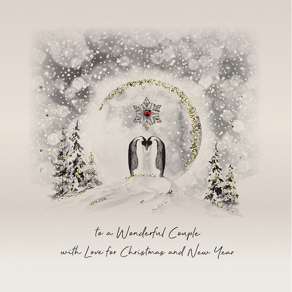 A beautiful Couple Christmas designs to conjure up everyone’s idea of an enchanted Christmas walk amongst freshly fallen snow. Illustrated onto a luxury board that glows like a fresh blanket of snow. Each Christmas card is hand painted with antique gold glitter and with a festive red gem.