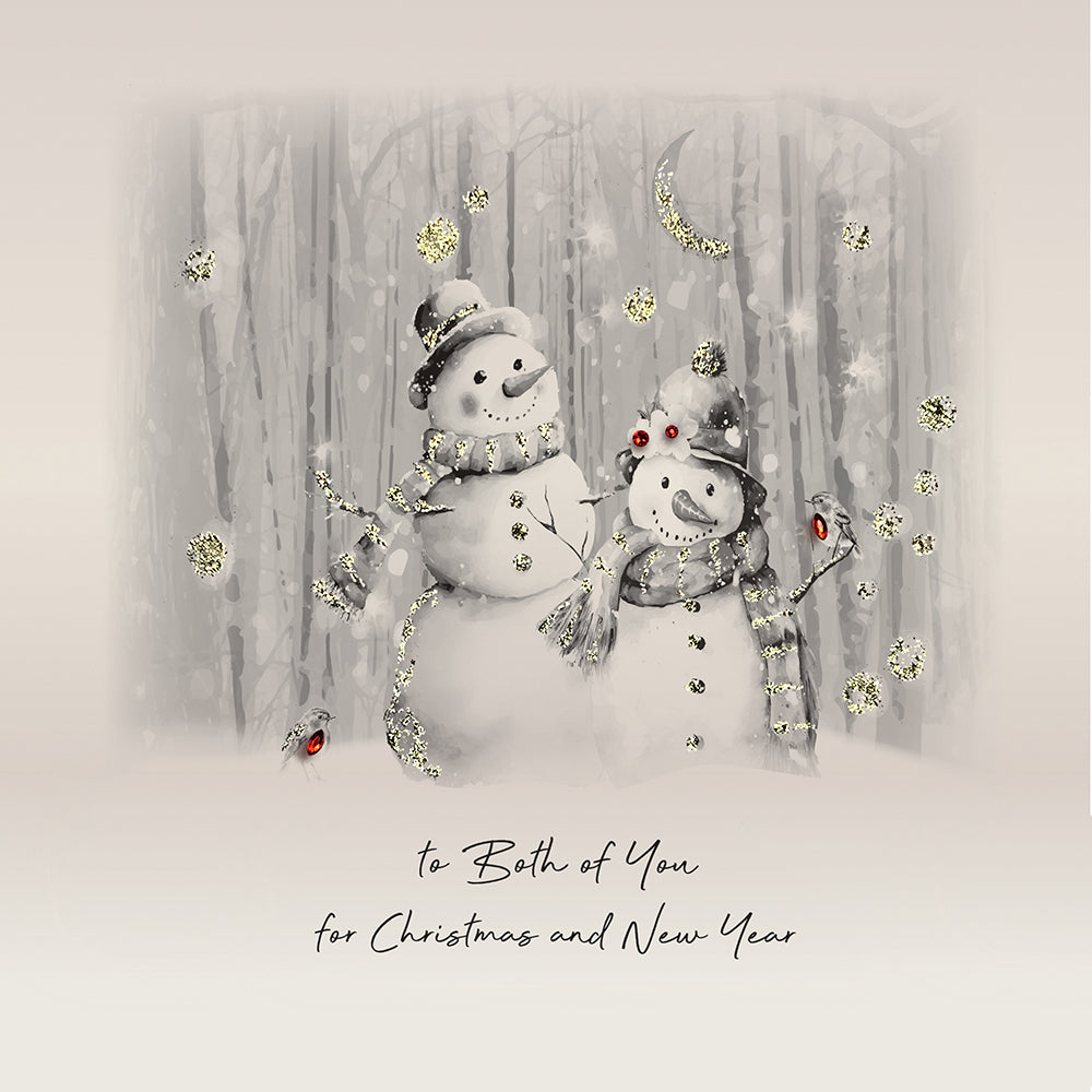 A beautiful Large Both Of You Christmas card design to conjure up everyone’s idea of an enchanted Christmas walk amongst freshly fallen snow. Illustrated onto a luxury board that glows like a fresh blanket of snow. Each card is hand painted with antique gold glitter and with a festive red gem.