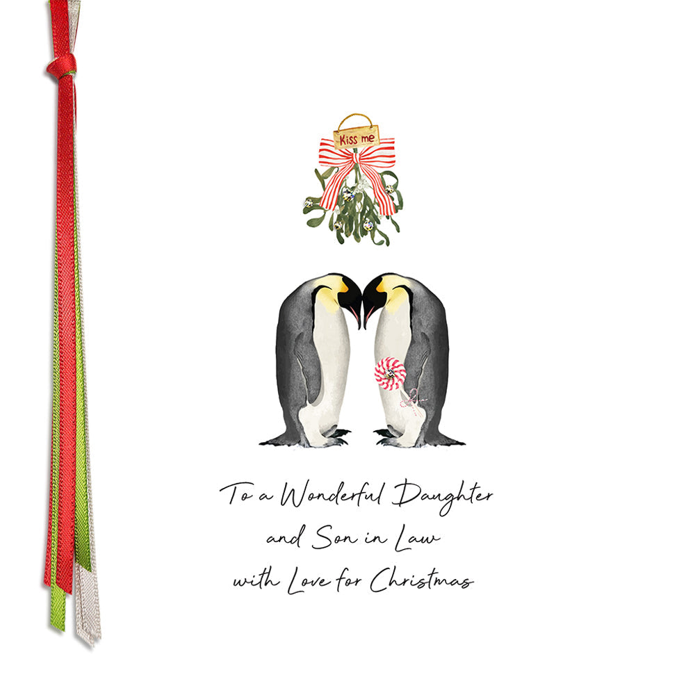Like tiny wrapped Christmas presents, these watercolour-style Daughter & Son-in-Law Christmas illustrations are each hand embellished with genuine crystals and a flourish of hand-tied satin ribbons.