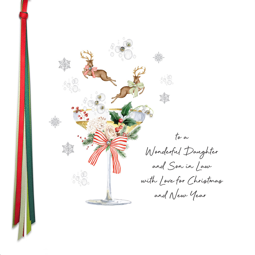 Like tiny wrapped Christmas presents, these Large watercolour-style Daughter & Son-in-Law Christmas illustrations are each hand embellished with genuine crystals and a flourish of hand-tied satin ribbons.