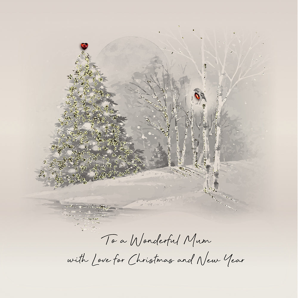 A beautiful Large Mum Christmas card design to conjure up everyone’s idea of an enchanted Christmas walk amongst freshly fallen snow. Illustrated onto a luxury board that glows like a fresh blanket of snow. Each card is hand painted with antique gold glitter and with a festive red gem.
