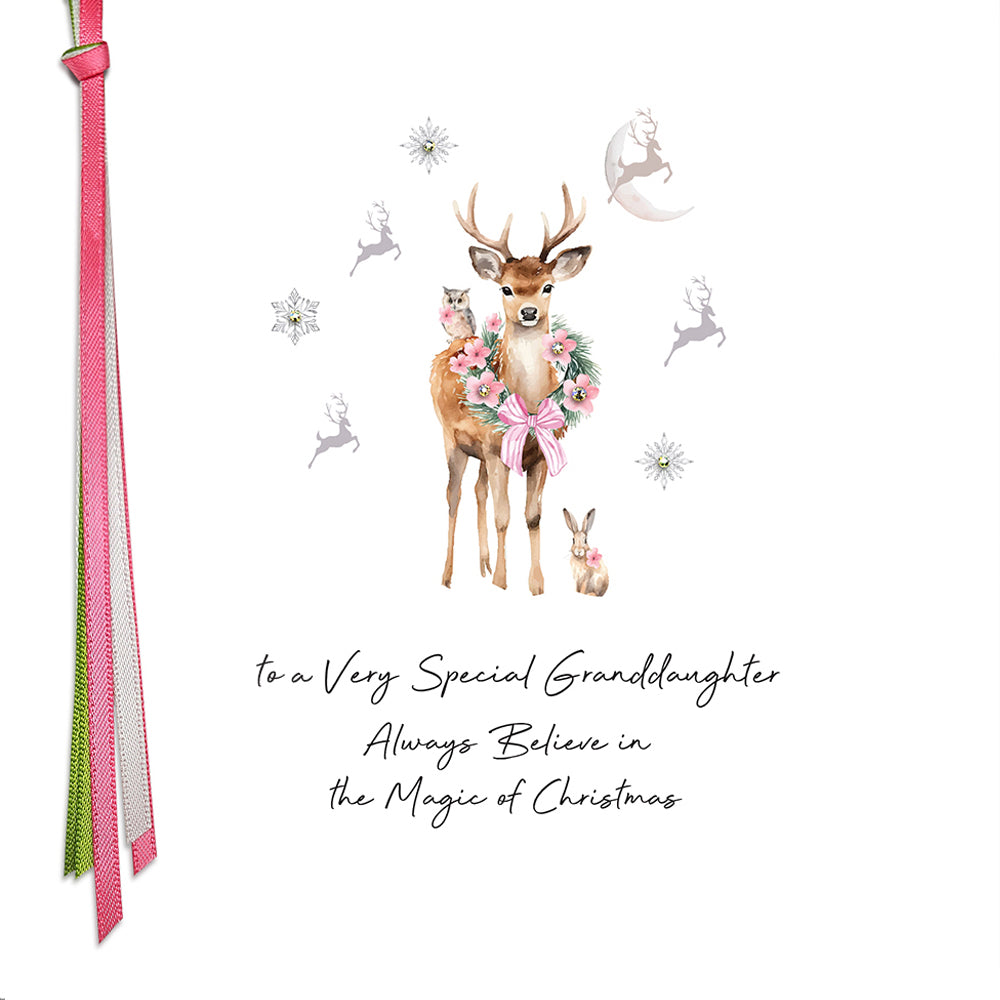 Like tiny wrapped Christmas presents, these watercolour-style Granddaughter Christmas illustrations are each hand embellished with genuine crystals and a flourish of hand-tied satin ribbons.