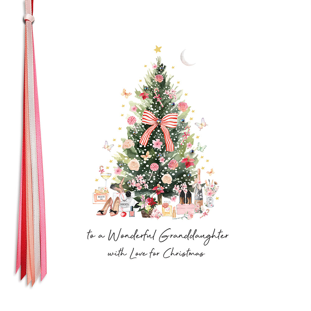 Like tiny wrapped Christmas presents, these Large watercolour-style Granddaughter Christmas illustrations are each hand embellished with genuine crystals and a flourish of hand-tied satin ribbons.