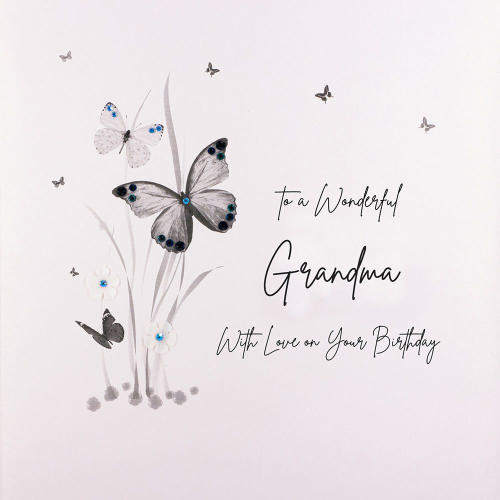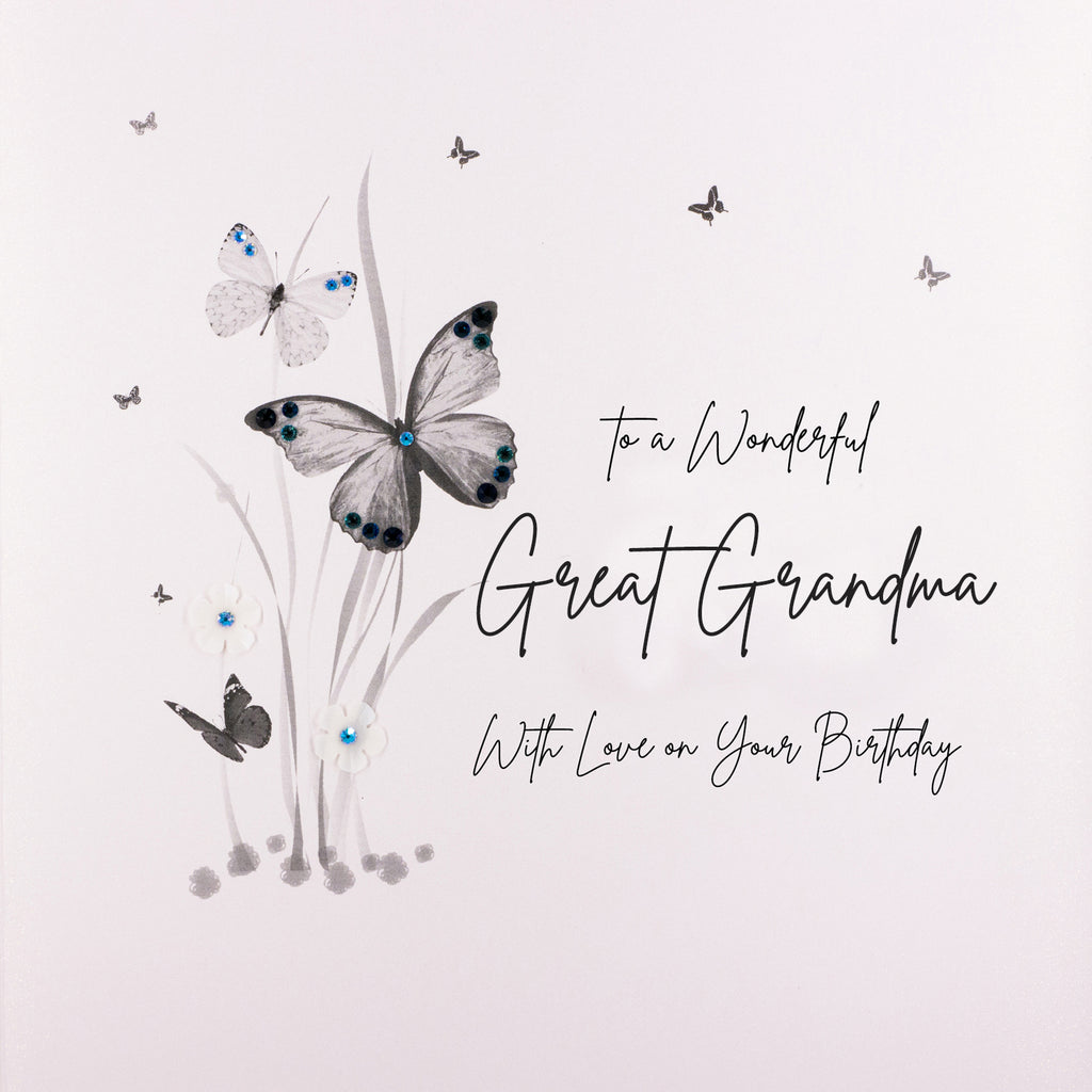 Our exclusive, magical pink blush board shimmers with flecks of sparkling gold. Charming, stylish and elegant large Great Grandma, Grandma or Nanna Birthday illustration, delicately and lovingly hand embellished with an array of stunning French sequins and genuine crystals.