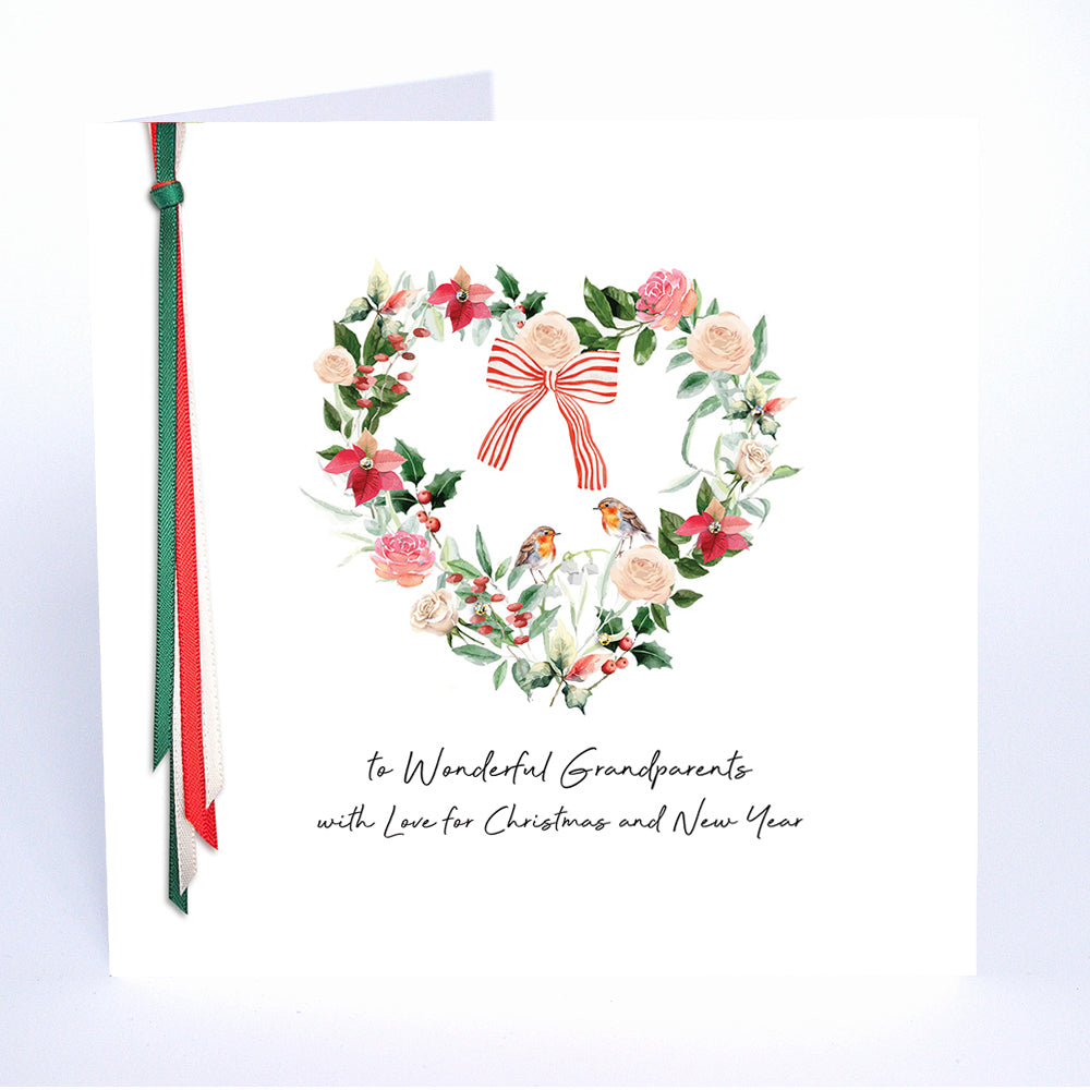 Like tiny wrapped Christmas presents, these watercolour-style Grandparents Christmas illustrations are each hand embellished with genuine crystals and a flourish of hand-tied satin ribbons.