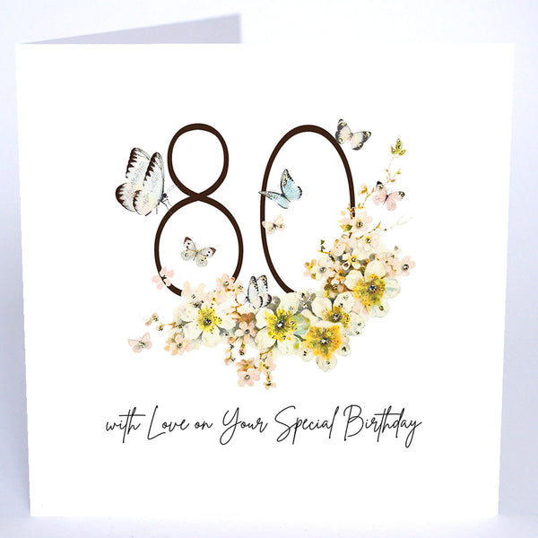 Nature springs to life with butterflies and blossom; cherry, peach, lilac and mimosa ~ it’s pure flower power! Hand painted Large 80th Birthday cards in peachy hues and brilliant iridescent coloured glitters. Each Large design is finished with genuine crystals.