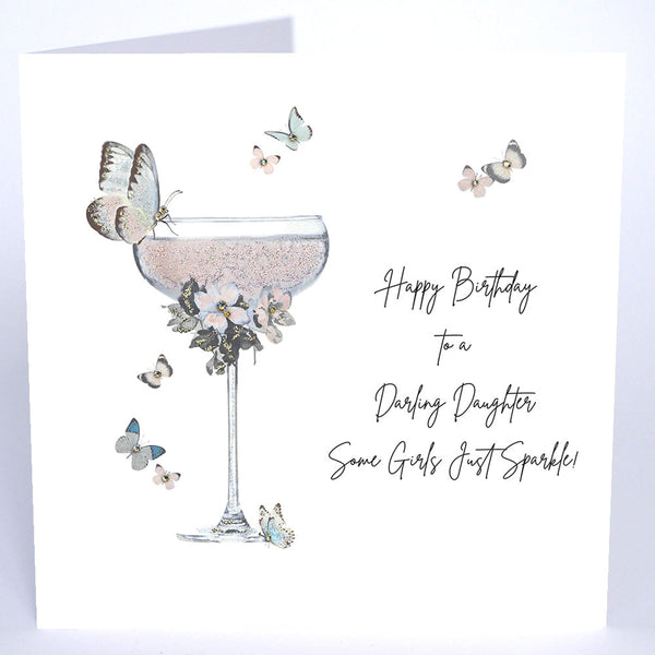 Nature springs to life with butterflies and blossom; cherry, peach, lilac and mimosa ~ it’s pure flower power! Hand painted Large Daughter Birthday cards in peachy hues and brilliant iridescent coloured glitters. Each Large design is finished with genuine crystals.