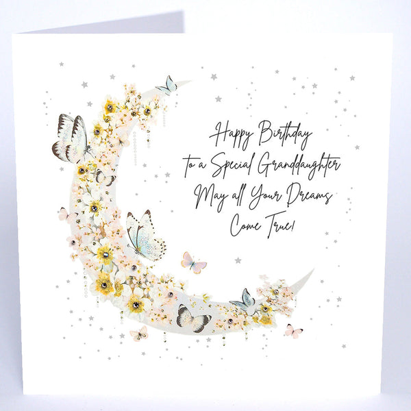 Nature springs to life with butterflies and blossom; cherry, peach, lilac and mimosa ~ it’s pure flower power! Hand painted Large Granddaughter Birthday cards in peachy hues and brilliant iridescent coloured glitters. Each Large design is finished with genuine crystals.