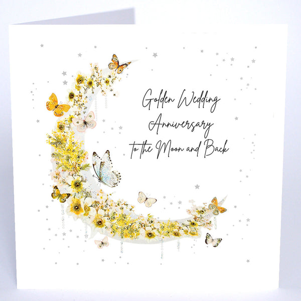 Nature springs to life with butterflies and blossom; cherry, peach, lilac and mimosa ~ it’s pure flower power! Hand painted Large Golden Anniversary cards in peachy hues and brilliant iridescent coloured glitters. Each Large design is finished with genuine crystals.