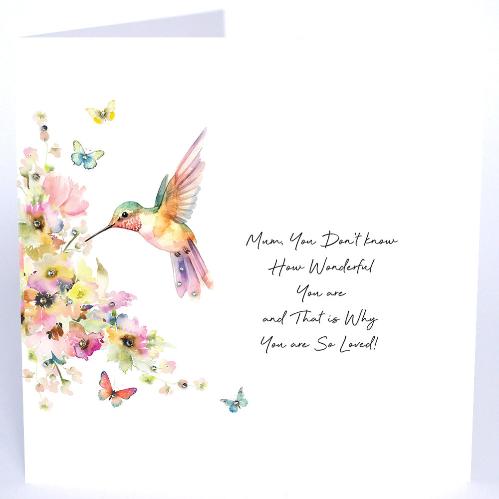 All things bright and beautiful. From champagne to butterflies, hummingbirds to Spring flowers ~ this is Large sized Mother's Day in wondrous colours and with more genuine crystals embellishing each card ~ than ever. If Mothering Sunday is about saying thank you, then this is the range to shout it from the rooftops!