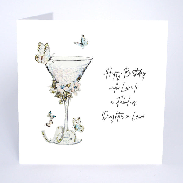 Happy Hour has arrived! Take a crystal cut glass and a healthy measure of your tipple. Add a mixer and Five Dollar Shake it over the rocks! This Cocktail coloured Daughter-in-Law Birthday design is individually hand painted and finished by our world class bartenders here in Sussex!