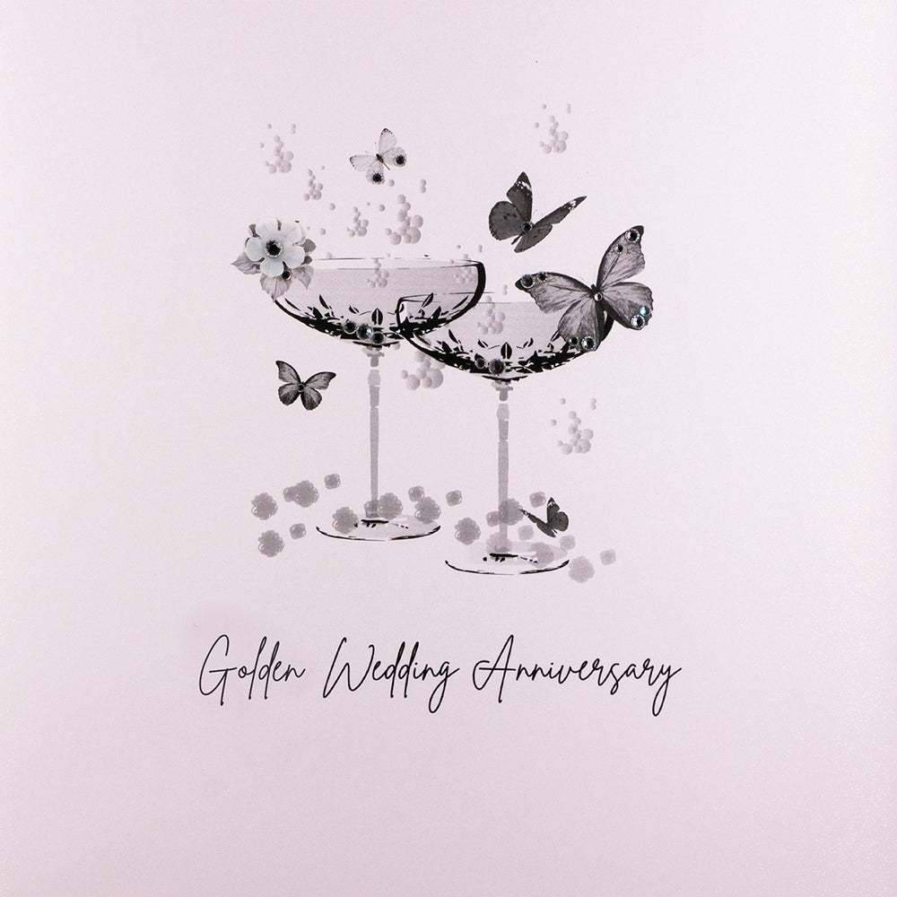 Our exclusive, magical pink blush board shimmers with flecks of sparkling gold. Charming, stylish and elegant large Golden Anniversary illustration, delicately and lovingly hand embellished with an array of stunning French sequins and genuine crystals.