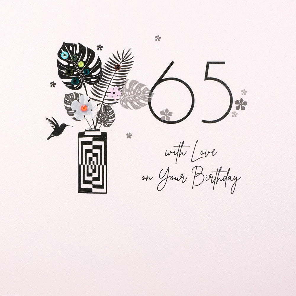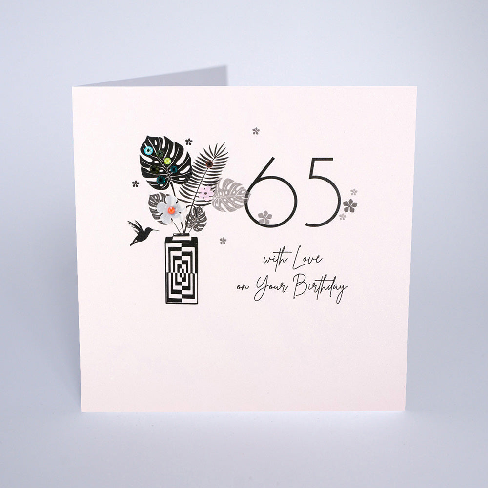 Our exclusive, magical pink blush board shimmers with flecks of sparkling gold. Charming, stylish and elegant 65th Birthday illustration is delicately and lovingly hand embellished with an array of stunning French sequins and genuine crystals.