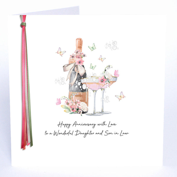 A beautiful range of love, celebration and magic! Featuring a delicate watercolour Large Daughter & Son-in-Law Anniversary illustration in vibrant colours, lovingly embellished with genuine crystals and hand-tied satin ribbons.